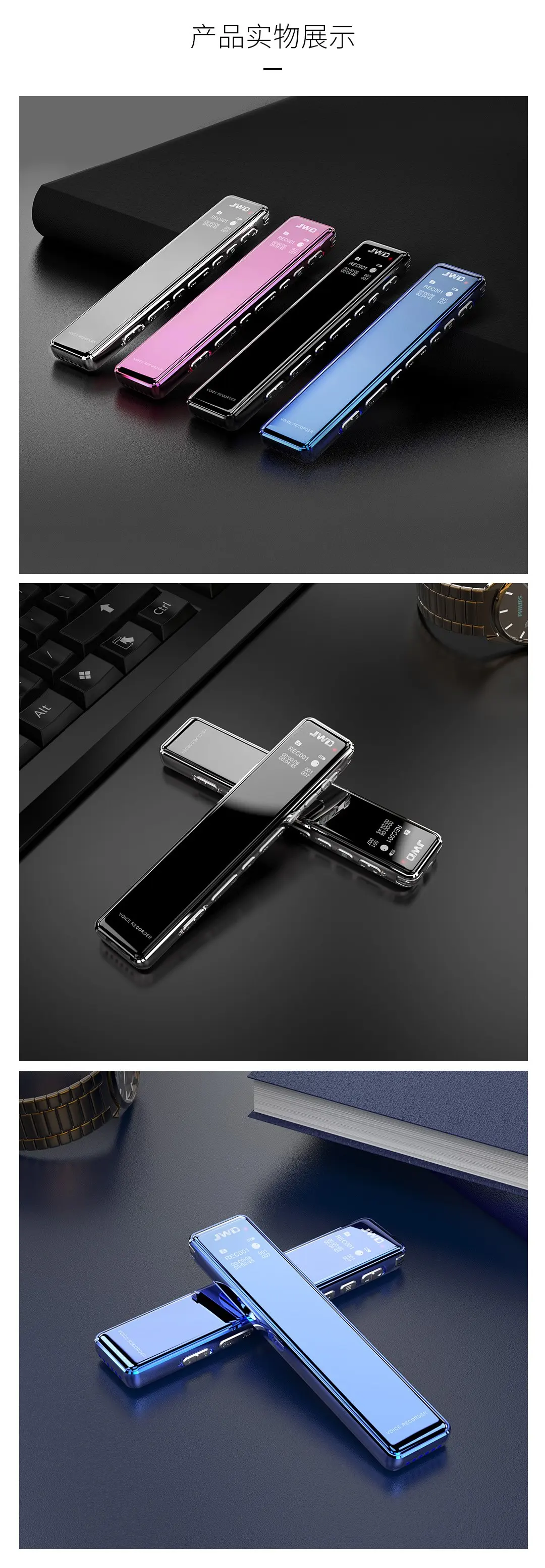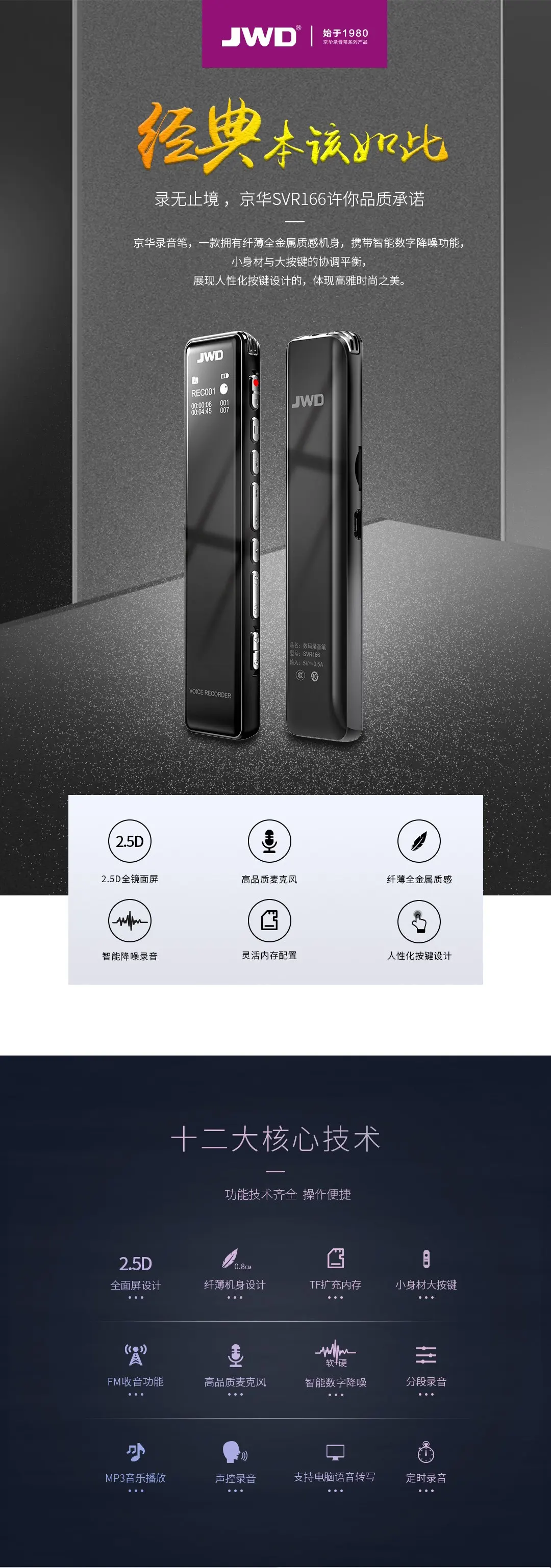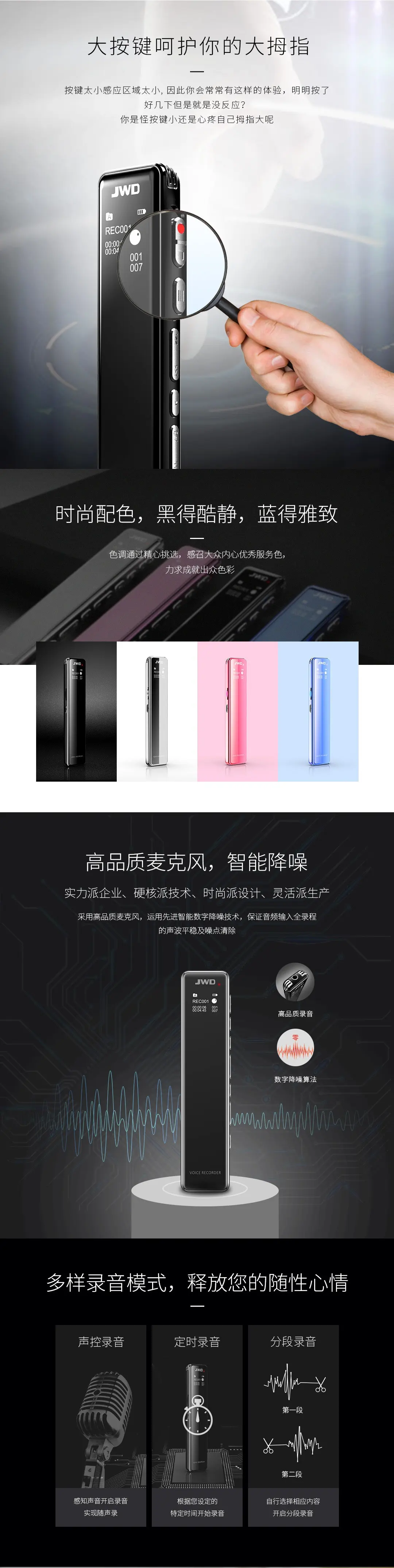 2.5D全镜面显屏,高品质麦克风,支持TF卡取换,人性化按键设计,智能数字降噪