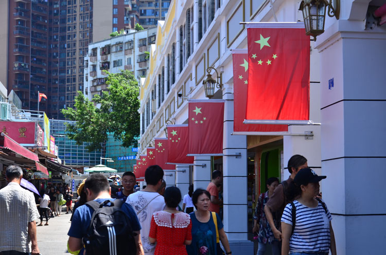 经过口岸边检检查完毕后,才算是真正进入到中英街景区内。一条窄小细长的小巷指引着前来观光的客人大步迈进,这就是著名的“一街两制”的中英街。细细品味街区的独特文化,一点点揭开它的神秘面纱。小巷的一边是香港生活的写照,繁体字的街边店铺和建筑物把香港的文化和中英街回归祖国前的历史面貌展现得淋漓尽致。小巷的另一边,则完全是中国元素的印记,一排排的小楼房整齐划一地漆上了干净、整洁的大白漆,墙上插满了一面面的中国国旗,显得如此的昂扬、豪气。